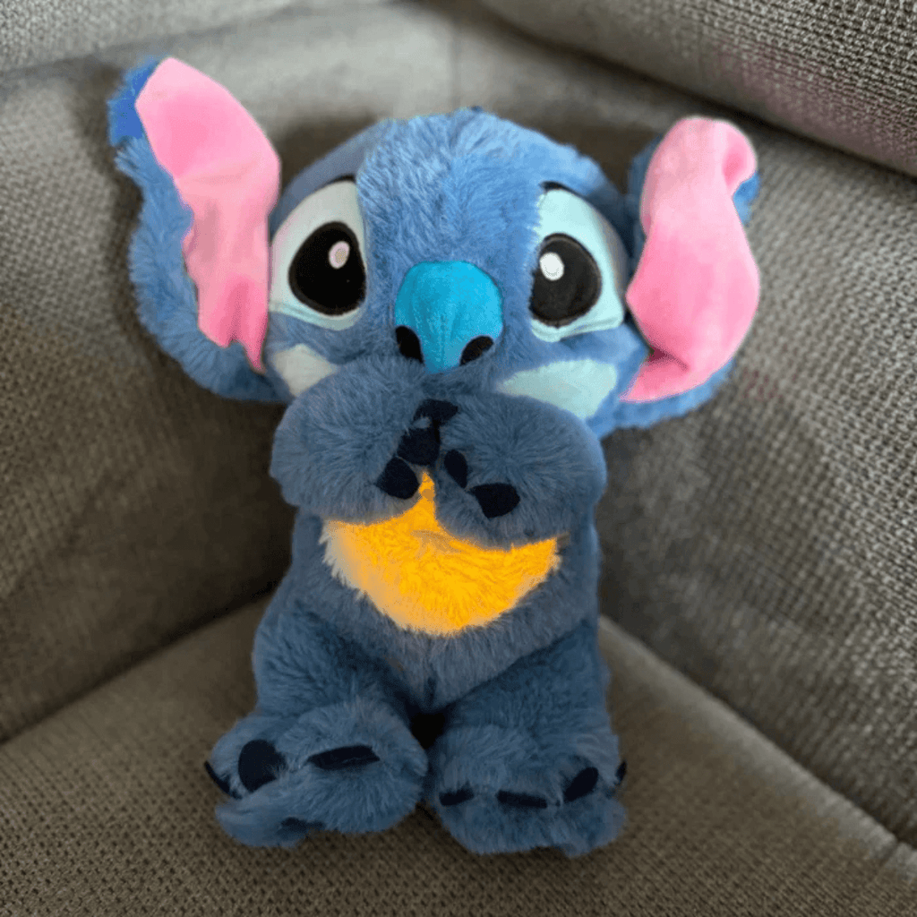O Little Stich reproduz sons realistas de respiração e batimentos cardíacos, simulando a presença reconfortante de um abraço.